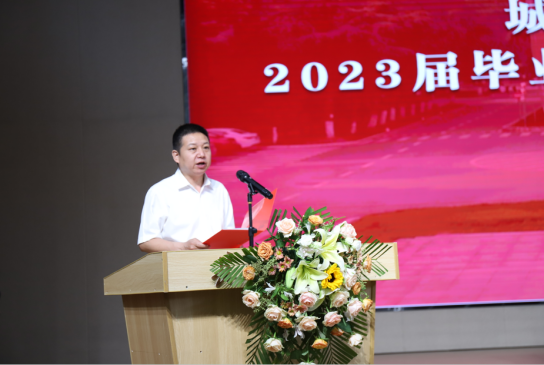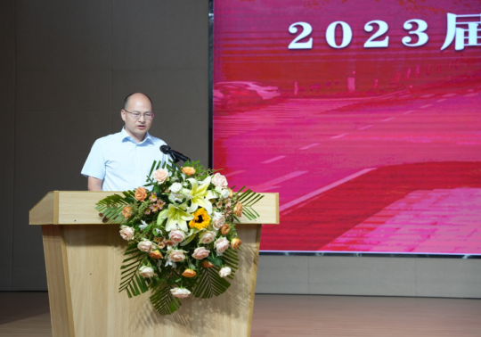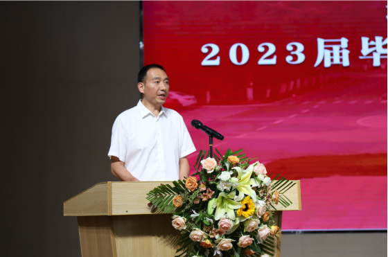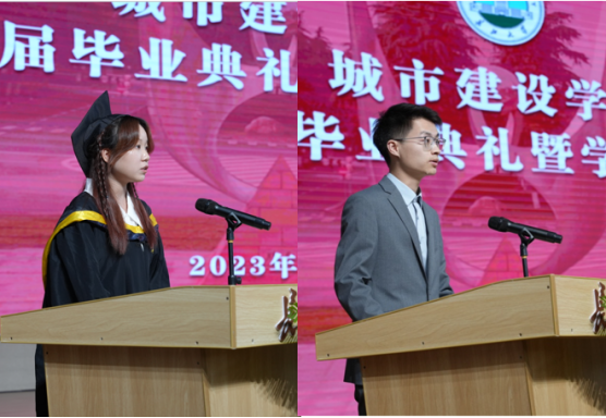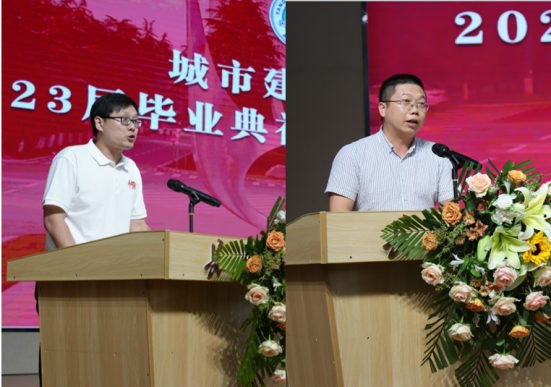院党委书记彭飞老师以“奋斗建设美好未来”为题寄语全体毕业生。他代表学院党委和行政向2023届顺利完成学业、获得学位的369名本科生、98名研究生表示最热烈的祝贺。“89人顺利考上国内外研究生,3人继续攻读博士学位……”他细数2023届毕业生的点滴进步与成长,并从学院院名中的“建设”及对人才培养的思考着手为全体毕业生上好“最后一课”。“‘建设’是一个充满力量、直面未来的动词”,他希望全体2023届毕业生以初心映照未来,建牢信仰根基;以信心激扬梦想,建功强国伟业;以恒心磨砺意志,建造美好生活;努力做新时代中国特色社会主义事业的合格建设者和可靠接班人。临近典礼尾声,彭飞老师即兴演唱了一首“长大版”《送别》送给全体毕业生:“长江畔、古城边,芳华忆此间。晚风拂面笑声残,夕阳催人征。天之涯,地之角,知己遍前路。一回长大相见欢,今日赴新程……”全场响起经久不息的掌声。