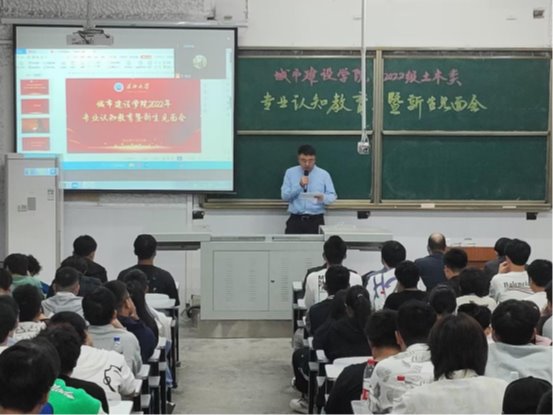 在9教208召开2022年专业认知教育暨新生见面会。院党委书记孙涛、院长曾磊、副院长张继承、副院长肖桃李、副院长叶长才等院领导及各专业主任出席本次会议,教学科研办公室和学生事务办公室代表及新生班主任、专业任课老师代表、全体2022级新生及18级学生代表参加会议。大会由党委副书记秦良斌主持。线上线下同步进行。