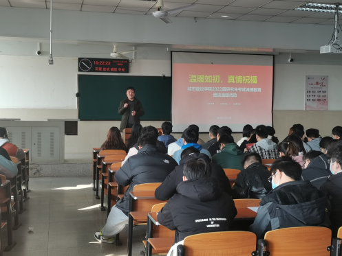 研究生考试诚信教育暨送温暖活动于12教502教室举行。院党委副书记周俊以及全体毕业年级辅导员出席本次会议,学院2022届全体考研学生参加会议。