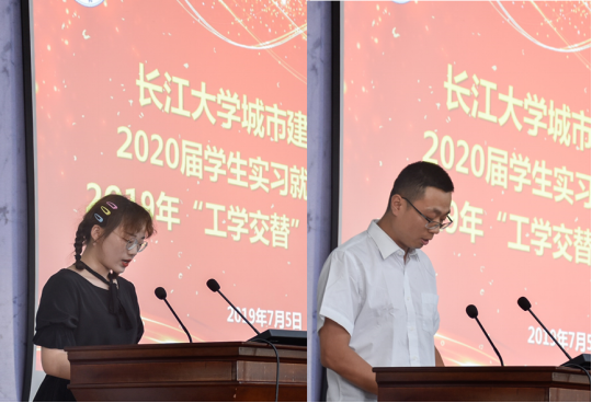 在工学交替师生代表发言环节,工程管理专业刘雅琪同学做了实习表态发言,表达了同学们遵守纪律、注意安全、潜心实践、创业报国的信念;土木工程系青年教师亓宪寅代表学院工学交替指导老师表示,一定尽己所能,认真指导学生开展生产实践,确保学生练本领、长才干。