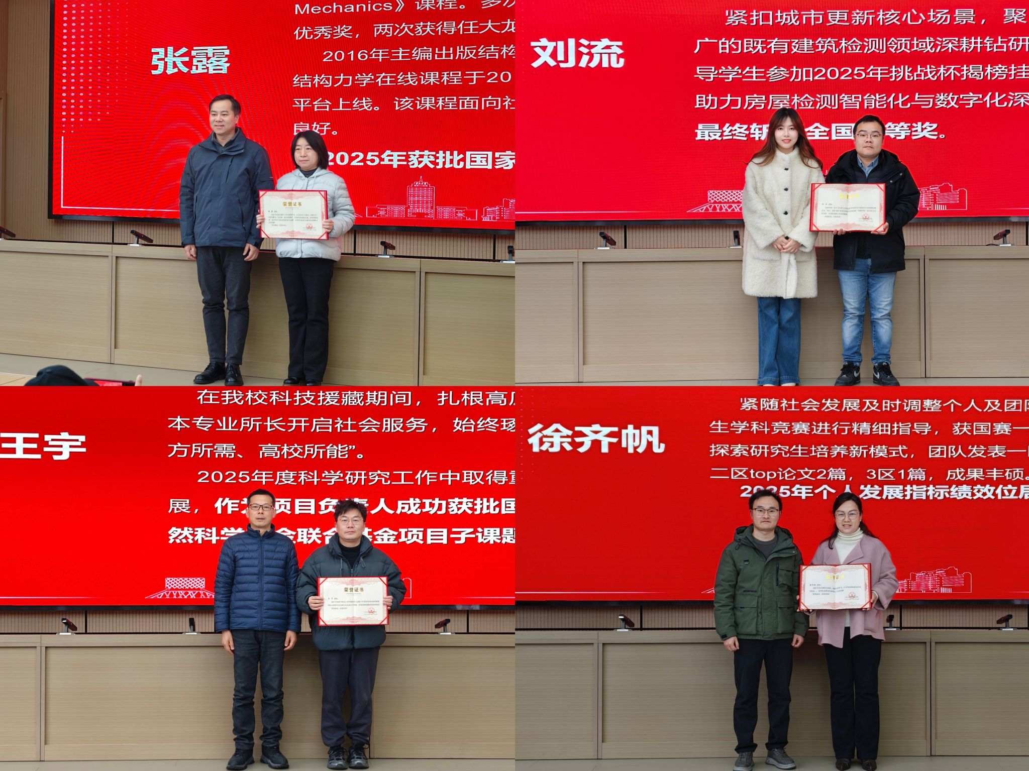 随后,院长助理赵云峰宣读了发展绩效突出贡献奖表彰文件,对2025年在教学、科研等领域取得优异成绩的教师予以表彰。其中,张露老师主持的《结构工程》课程成功获批国家一流本科课程,为学院本科教学质量提升注入强劲动力;刘流老师深耕学科竞赛指导工作,带领学生在2025年“挑战杯”揭榜挂帅专项赛中斩获全国特等奖,充分彰显了学院实践育人的显著成效;王宇作为项目负责人,成功获批国家自然科学基金联合基金项目子课题,学院科研创新能力再获权威认可;徐齐帆在年度科学研究与人才培养工作中成果丰硕,其带领的团队发表多篇高水平学术论文,个人发展指标绩效更是位居全院首位。