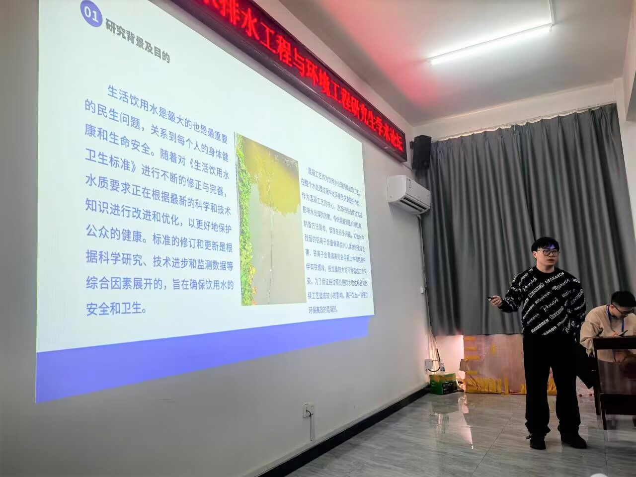 2023级研究生何傲腾在会议中作题为“聚硅酸铁镐-改性淀粉复合混凝剂制备及其性能的研究”的分享汇报,内容主要聚焦于天然材料和金属盐混凝剂的复合制备。通过改性淀粉与锆盐混凝剂的复合,旨在研究出一种安全无害、环境友好的复合混凝剂。