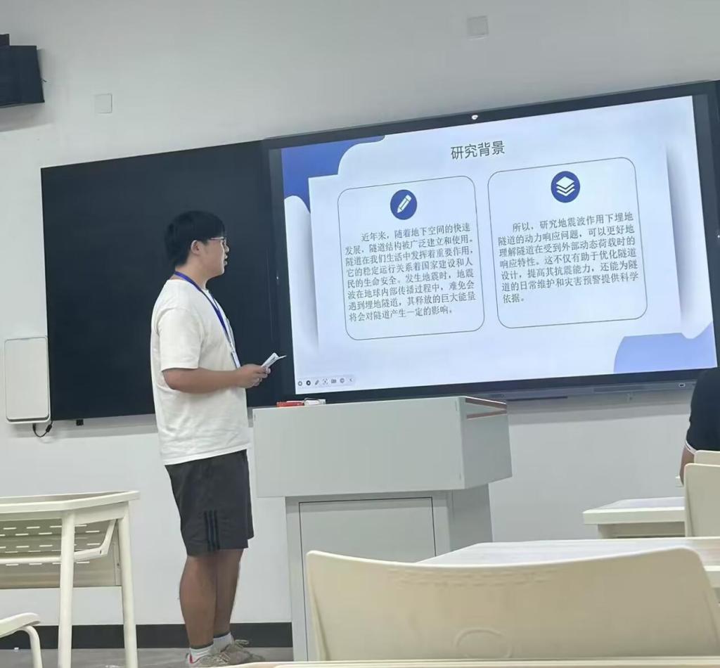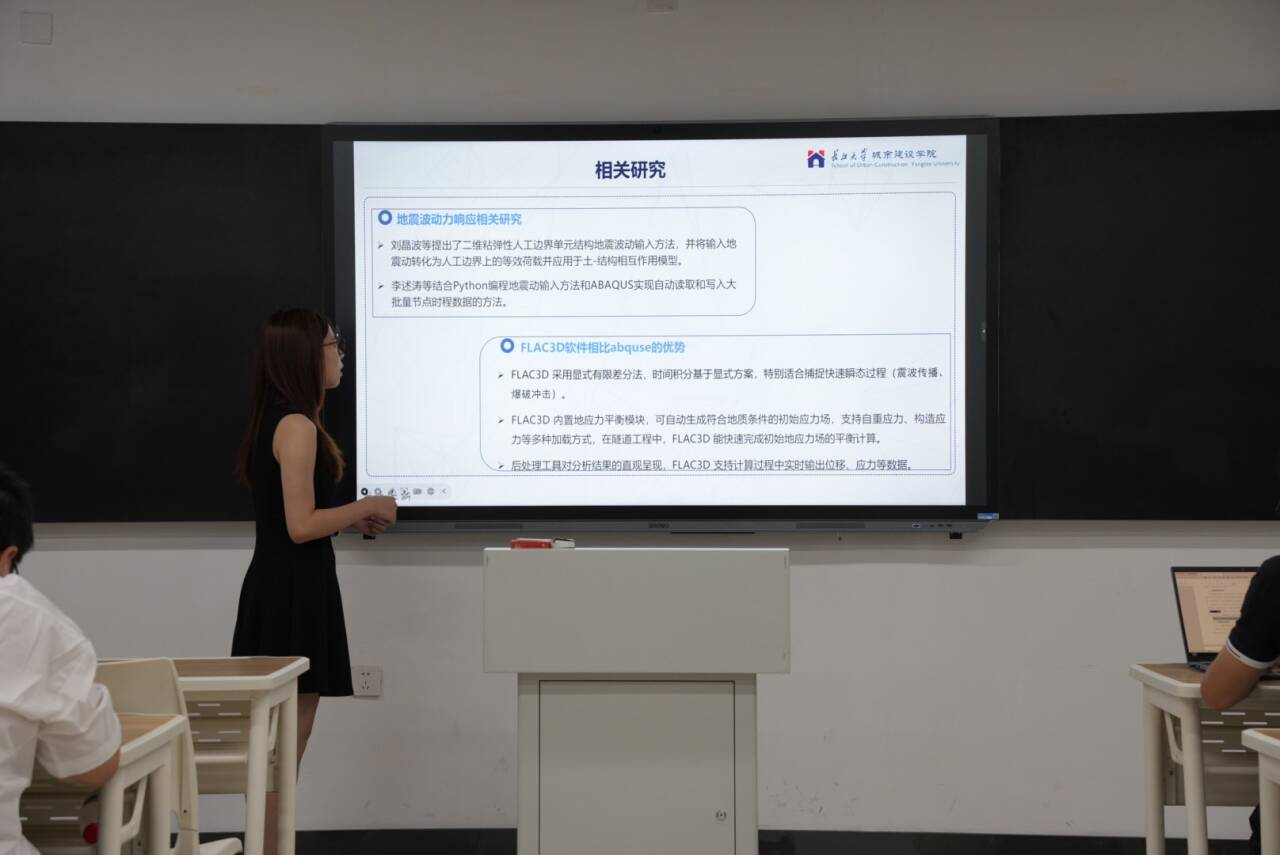 2023级研究生孙睿哲在论坛中以“SV波和P波作用下隧道动力响应特征研究”为主题进行了汇报,内容主要聚焦于结合 FLAC3D 与 MATLAB 软件,研究地震波斜入射下隧道动应力响应的分析方法。通过理论软件结合揭示不同地震动参数下SV波和P波的传播规律及其对地下隧道的动力响应机制,旨在准确评估地震荷载对隧道结构的损伤效应,同时为提升城市地下空间抗震能力提供理论支撑与技术参考。