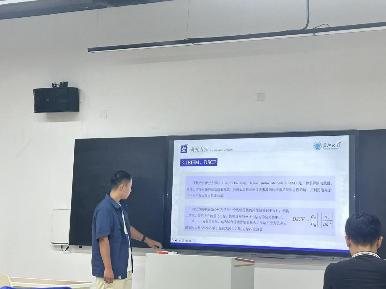 2023级研究生易舜在论坛中以“SH波作用下城门洞形隧道动力响应分析”为主题进行了汇报,内容主要以全空间中的深埋城门洞形隧道为研究对象,以间接边界积分方程法(IBIEM)和弹性波动理论为基础,对在平面SH波作用下的城门洞形隧道的动力响应问题展开研究,旨在更好地理解隧道在受到外部动态荷载时的响应特性。这不仅有助于优化隧道设计,提高其抗震能力,还能为隧道的日常维护和灾害预警提供科学依据。