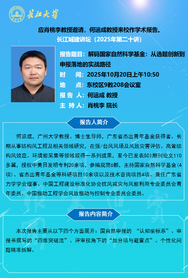 长江城建讲坛2025年第二十讲:解码国家自然科学基金:从选题创新到申报落地的实战路径