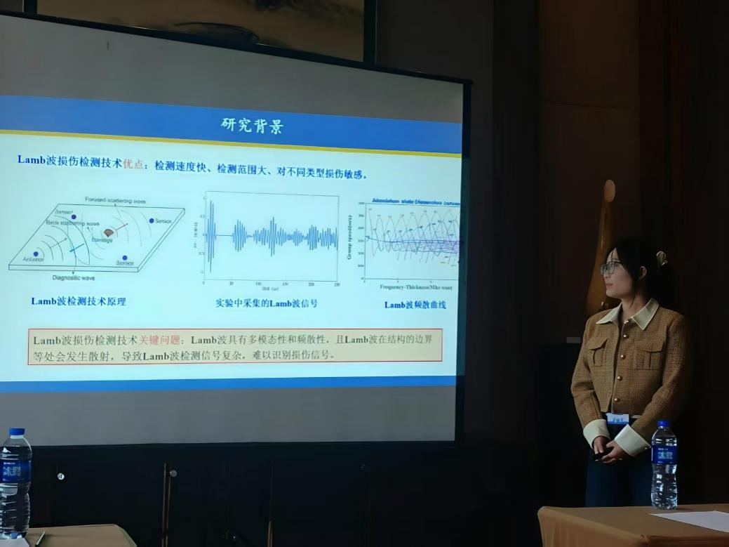 2024级研究生张思思在“结构超声智能监测与健康监测”分会场中以“基于Lamb波与深度学习的板类结构多损伤智能识别”为题进行了汇报,研究以120 mm×120 mm铝板为研究对象,结合Lamb波主动传感、Transformer-CNN混合深度学习框架及多通道信号融合技术,针对板类结构多损伤位置快速标定与损伤程度量化问题展开研究,旨在克服Lamb波多模态、频散及边界散射导致的信号复杂难题,实现高精度、强泛化的损伤模式自动识别,为提升板类结构在服役期间的健康监测效率、降低传统无损检测的人工成本,以及航空航天、船舶及土木领域薄壁结构的数字化运维与安全预警提供算法支撑。