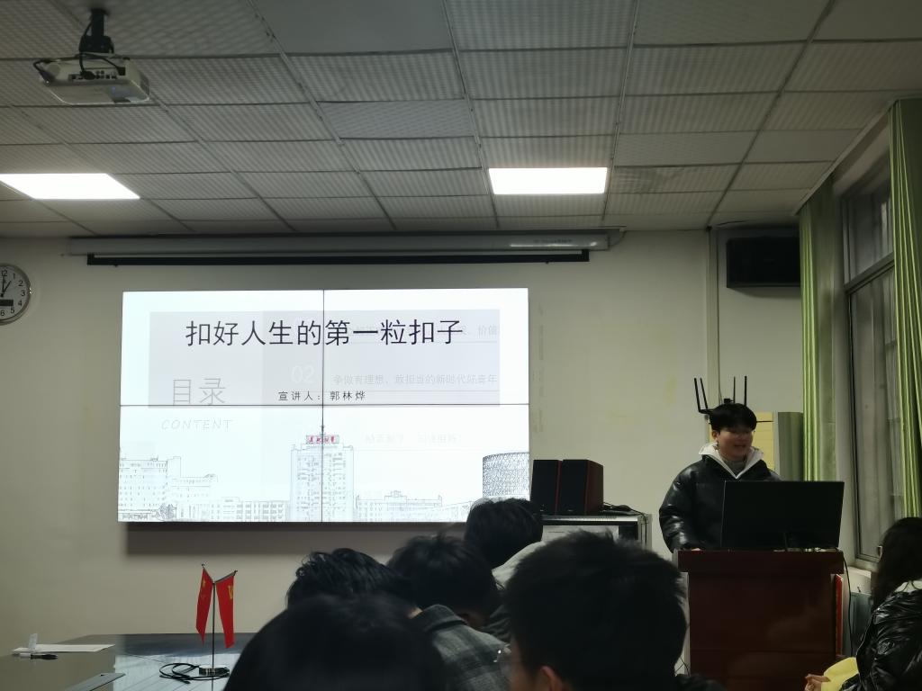 在分享阶段,郭林烨同学首先从“扣好人生的第一粒扣子”出发,向同学们解释了“扣好第一粒扣子”的重要性,鼓励同学们在青年时期艰苦奋斗,努力成长。之后,蔡佳择同学从党和国家对青年的期望出发,介绍新时代好青年的基本素质,再结合新发展理念分享对青年成长的理解,从这两个方面讲述了青年应回应党和国家的期待,在实现中国梦的道路上挺膺担当这个主旨。最后,刘倞同学从习近平总书记关于青年工作的重要思想、对青年的殷切希望和重要要求、争做有理想、敢担当、能吃苦、肯奋斗的新时代好青年三个方面对分享做了总结。