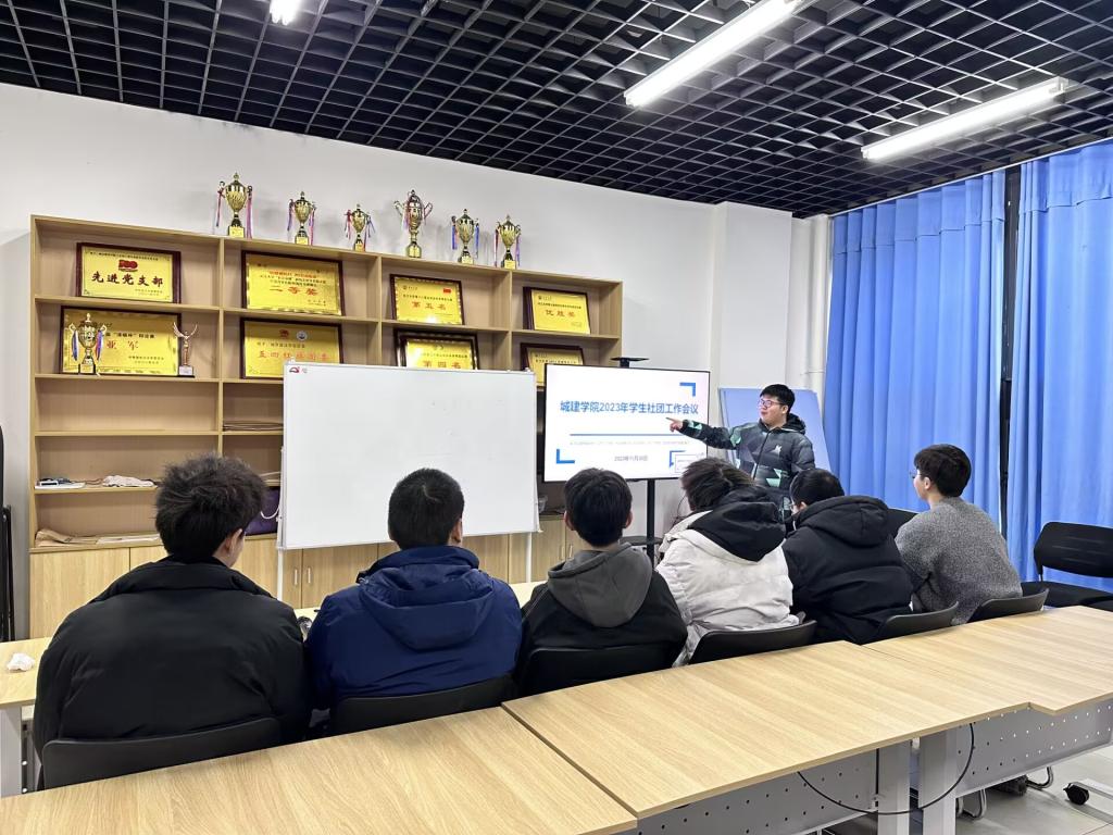 学 生社团工作会议在 22 栋 124 会议室召开,院团委副书记刘安琪,院团委社团部成员,校级学生社团建筑模型协会以及结构设计协会、BIM 研学会、节能减排协会、大学生艺术团、退役士兵之家等院级社团负责人参加会议。