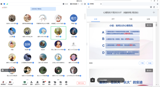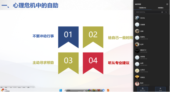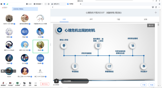 (通讯员 江子航2023年76中午12:30学院在雨课堂和腾讯会议开展以“心理危机干预与自杀预防”为主题的心理骨干培训会议,参加会议的有学院研究生代表和19级-22级学生干部。学院学工办主任周洁如老师担任主讲