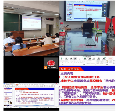 本次班会分为以下几个议程:首先是督促全体学生全覆盖参加星空班会“防电诈学习”,要求漏学者务必补学,并要求各班保存学习截图,整理后打包上交。然后针对江陵县出现了三名“新冠”核酸检测呈阳性人员,荆州疫情防控形势愈发严峻的现状,反复强调了学校的防控要求,即:全体学生非必要不出校门、发热后规范处置有补贴、出校门要书面审批;新到校学生必须在宿舍“居家观察”、按时完成“七天五检”;校外居住学生尽可能减少流动,门对门出入校园和宿舍。最后开展全员防溺水教育,通过分享一系列近期发生的溺水事件,提醒学生要提高安全防范意识,远离危险水域谨防溺水事故的发生。