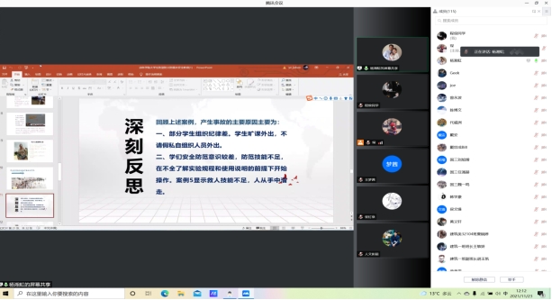 于11月23日中午12:00于线上举行安全教育讲座。此次安全教育由杨湘虹和彭超两位老师主持,分别从《大学生防盗防火防溺水安全教育》和《大学生心理安全教育》两方面展开。杨湘虹老师从宿舍用电,防止溺水,预防盗窃三大方面展开讲解,杨老师以因宿舍使用违规电器引起火灾的事例来告诫大家,他提到大家对危险因素不应抱有侥幸心理,并告诫大家节假日期间远离陌生水域,保证自身生命安全。最后老师讲解了常见偷盗手法并介绍了防盗小技巧。