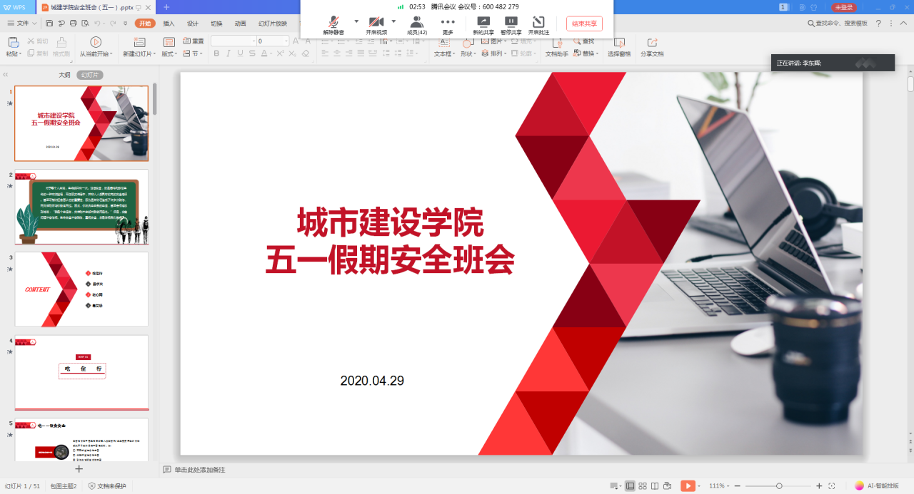 于4月28日—4月30日,以班级为单位召开了以“居家安全教育”为主题的线上班会和家长会。会议由各年级辅导员、班主任主持,全体学生及家长通过腾讯会议、QQ直播等方式参加。