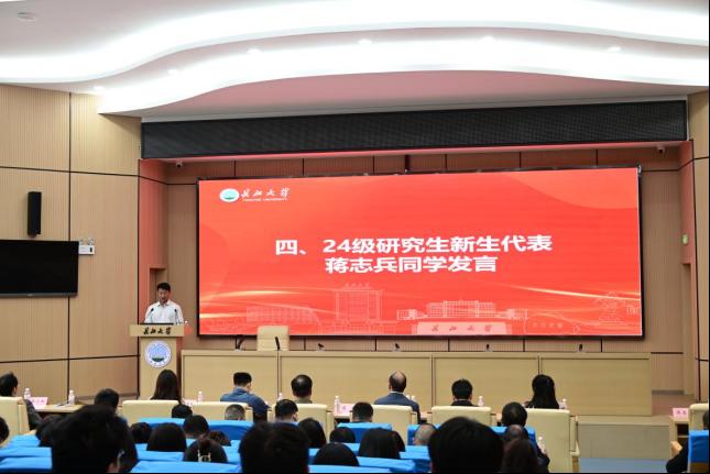 蒋志兵作为新生代表进行发言。他号召同学们投身科研,追求卓越;实践躬身,自我完善;置身伟业,青春梦圆。