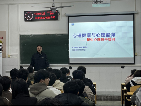 面向2024级本科和研究生学生干部开展秋季学期新生心理骨干专题培训。各班级班委及宿舍长参加了此次培训讲座,学院心理专干魏民生担任主讲人。