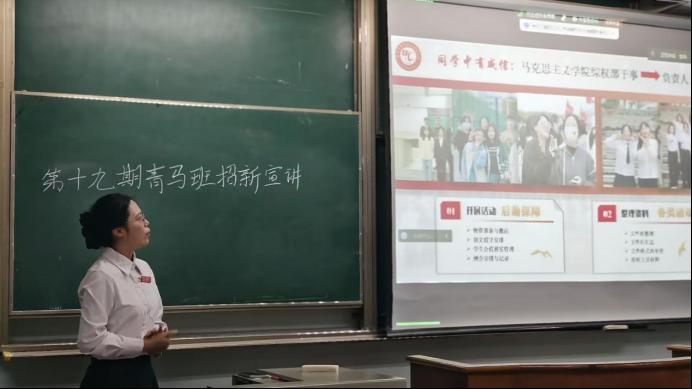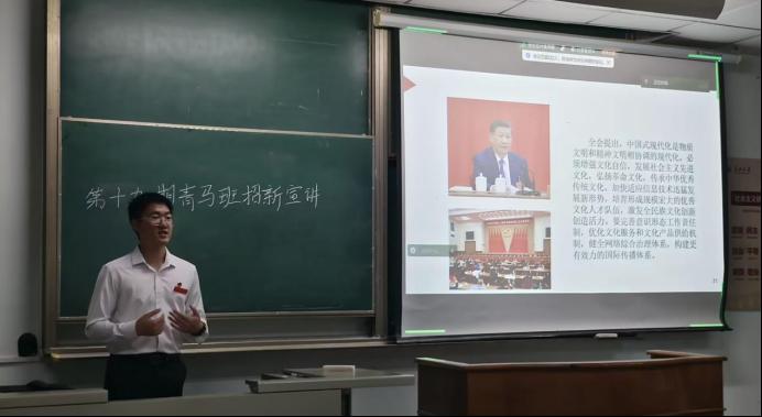 青马班宣讲团成员谭江湖表示,“青马班学员不仅要在思想层面提升自我要求,还需妥善平衡学业与思想建设的关系,这对个人能力颇具考验”。他谈及青马班“早起床、早锻炼、早自习”的“三早”文化,以及理论与实践相结合的课程学习模式,皆为对学员能力的锻炼与磨砺。此外,宣讲团还介绍了“百生讲坛”“激励晨会”“红色研学”等青马班特色品牌活动,鼓励同学们积极投身青马班,融入这个充满信仰与思想活力的集体。