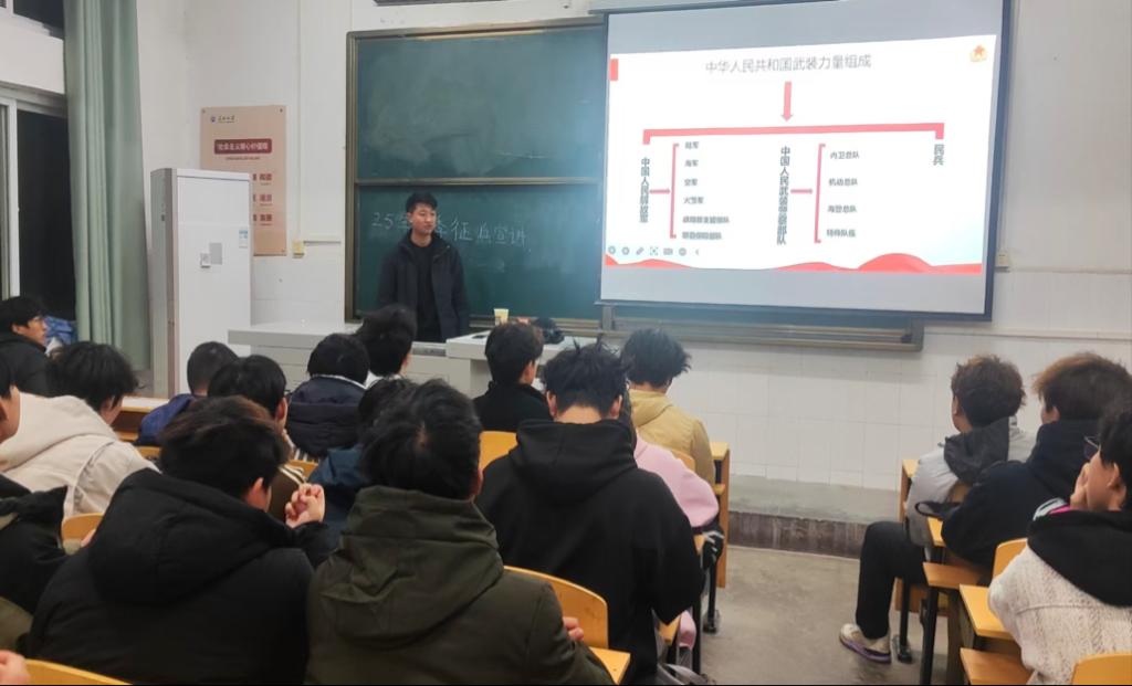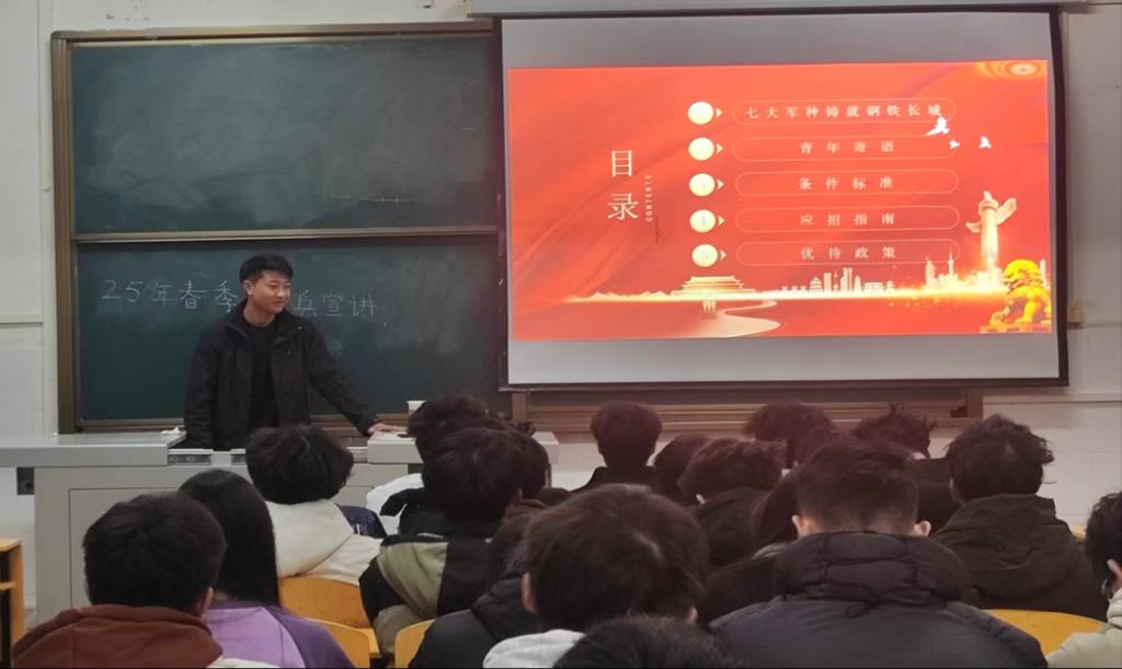 在西校区2教208教室举行了2025年春季征兵政策宣讲会。本次会议由学院退役士兵蒋志兵主讲,2024级辅导员袁子昂主持,部分有意应征入伍同学参会。