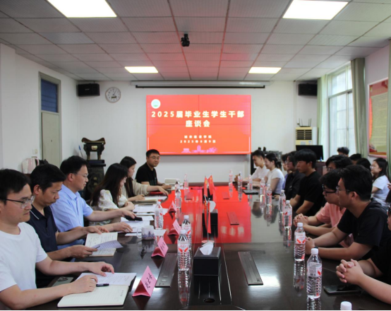 在9教208会议室召开2025届毕业生干部座谈会。学院党委书记谌姿、党委副书记周洁如、副院长黄向阳、院长助理赵云峰及毕业年级辅导员参会,会议由周洁如主持。