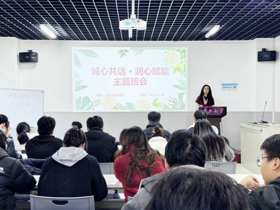 “城心共话·润心赋能”谈心教育主题班会在22栋124会议室举行。研究生辅导员盖东芳与研究生一年级学生开展面对面深入交流。