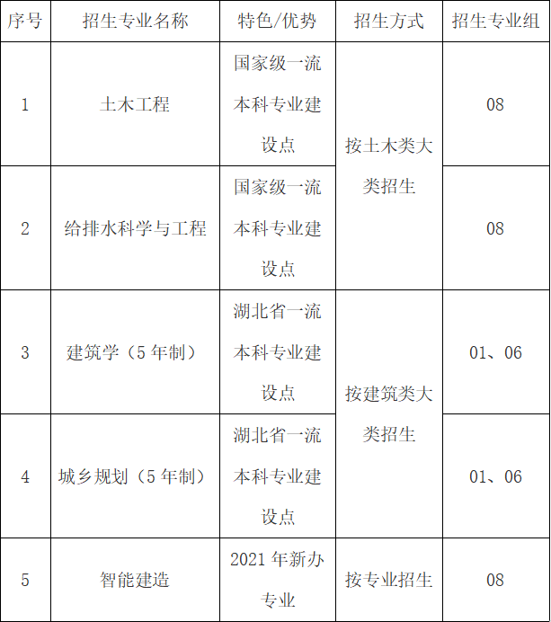 学院开办5个本科专业:土木工程、给排水科学与工程、智能建造、建筑学(5年制)、城乡规划(5年制),在土木工程专业开展中外合作和留学生教育。土木工程、给排水科学与工程是国家一流本科专业建设点,建筑学和城乡规划专业是湖北省一流本科专业建设点。土木工程专业于2014、2017年两次通过工程教育认证,给排水科学与工程于2021、2024年两次通过专业评估认证。土木工程学科为省级重点学科,学院拥有2个一级学科硕士点:土木工程、建筑学;1个专业硕士学位授予点:土木水利;在石油与天然气工程一级学科博士点下培养博士研究生。在校本科生、研究生、留学生规模1800余人。