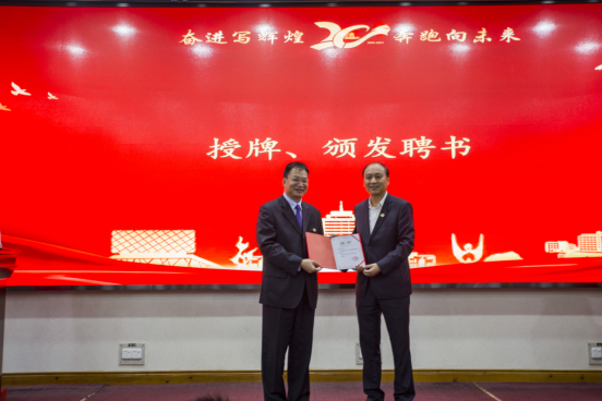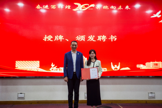 校友会成立文件,并主持了揭牌仪式和颁发聘书环节。学院校友会首任会长谌姿,副会长肖桃李、眭立、卢卫东、邢超、贺翔、邹鹏程、李雄飞,秘书长周洁如,副秘书长李先华、周莉、靳方倩上台接受聘书。