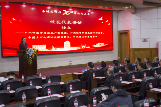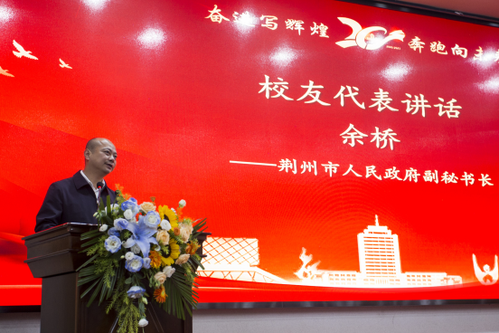 校友代表,广州市国资委派驻广药集团、广州数字科技集团专职董事眭立,北京校友会副会长邹鹏程,荆州市人民政府副秘书长余桥依次讲话。他们深情回顾了往昔在学院的求学生涯,追忆师生情谊、同窗岁月等,纷纷表示将积极回馈母校,助力学校和学院发展。